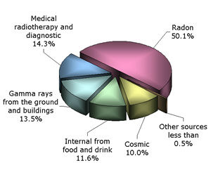 The relative radiation exposure of the average member of the UK population from all sources is: